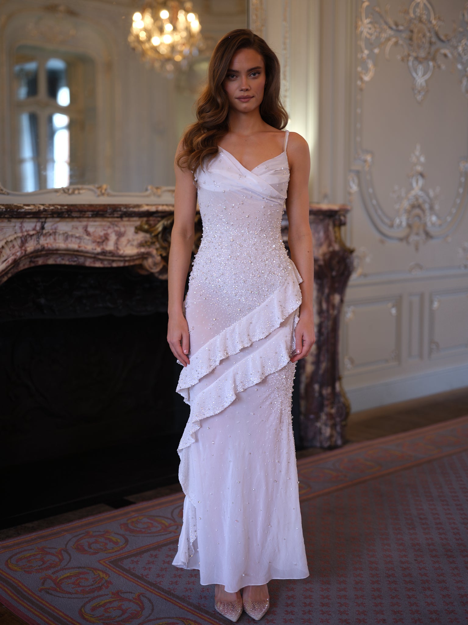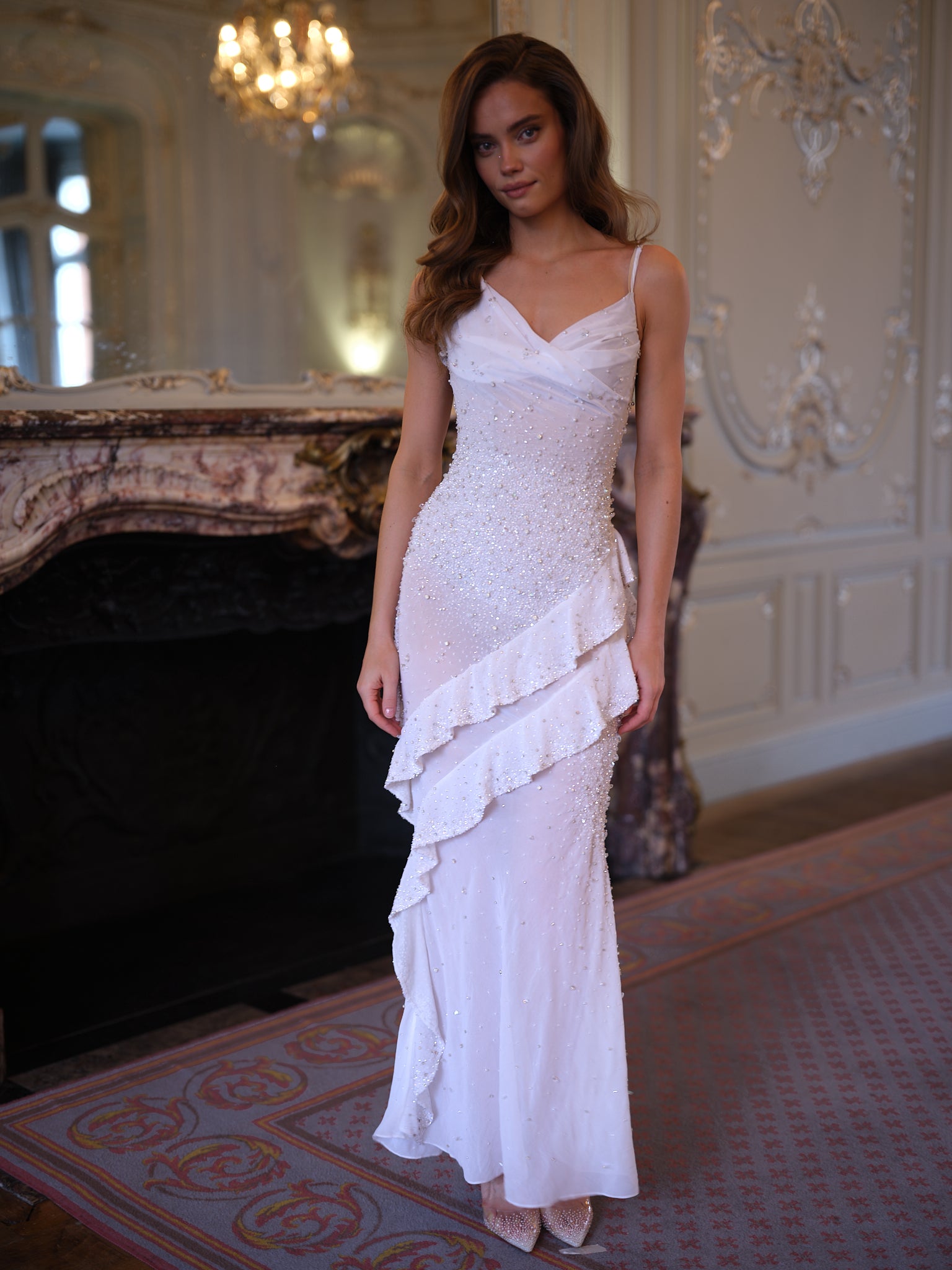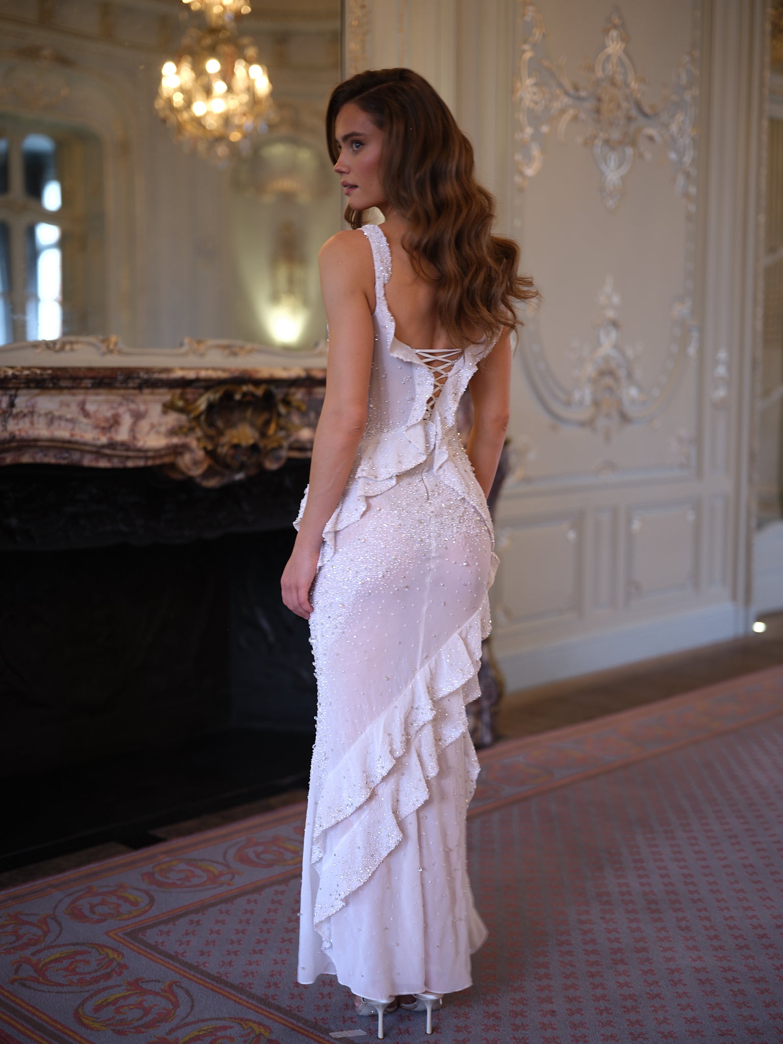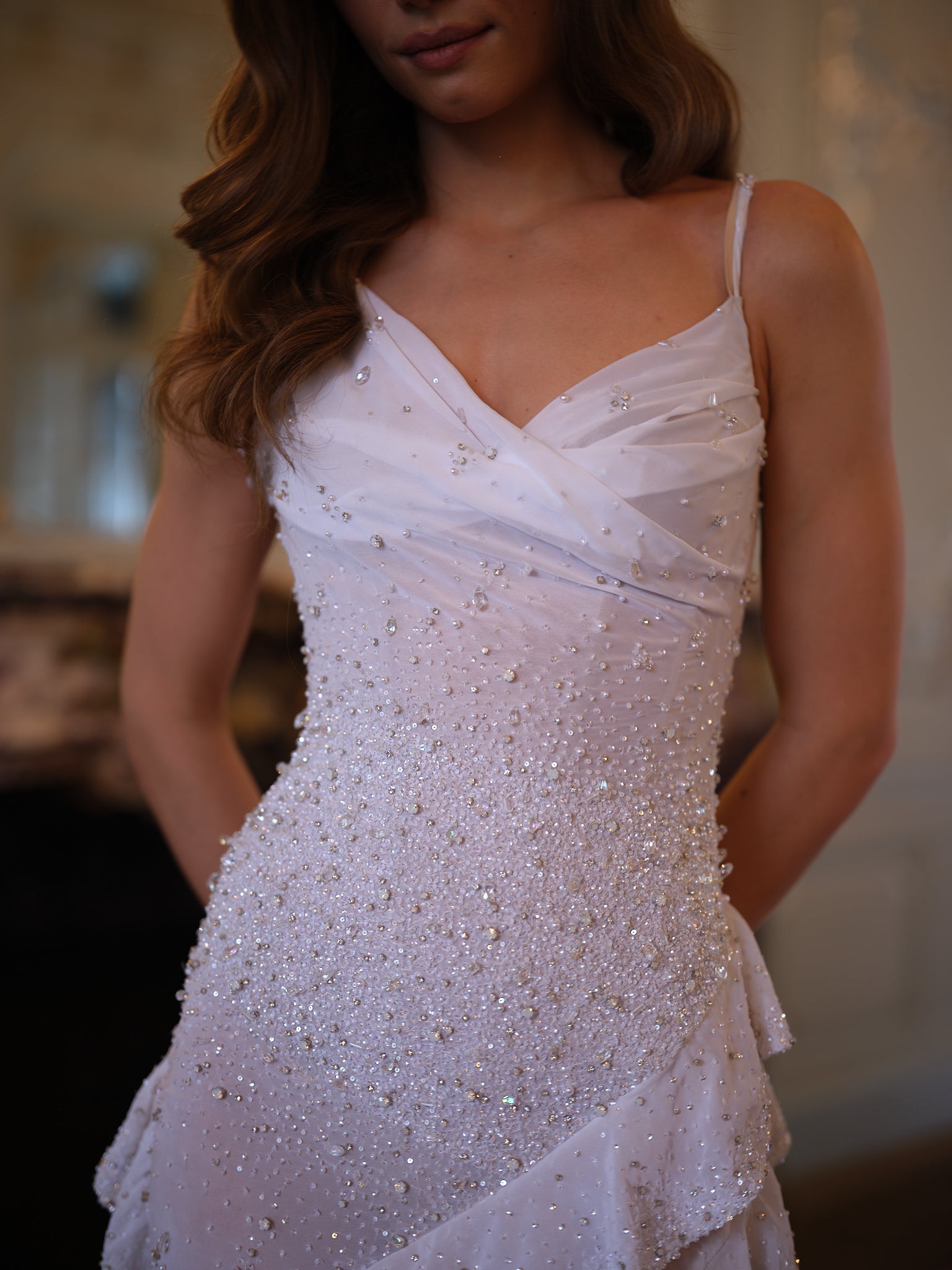 Anastasia is the embodiment of soft glamour and meticulous artistry - a gown designed to shimmer, sculpt, and flow with effortless grace.