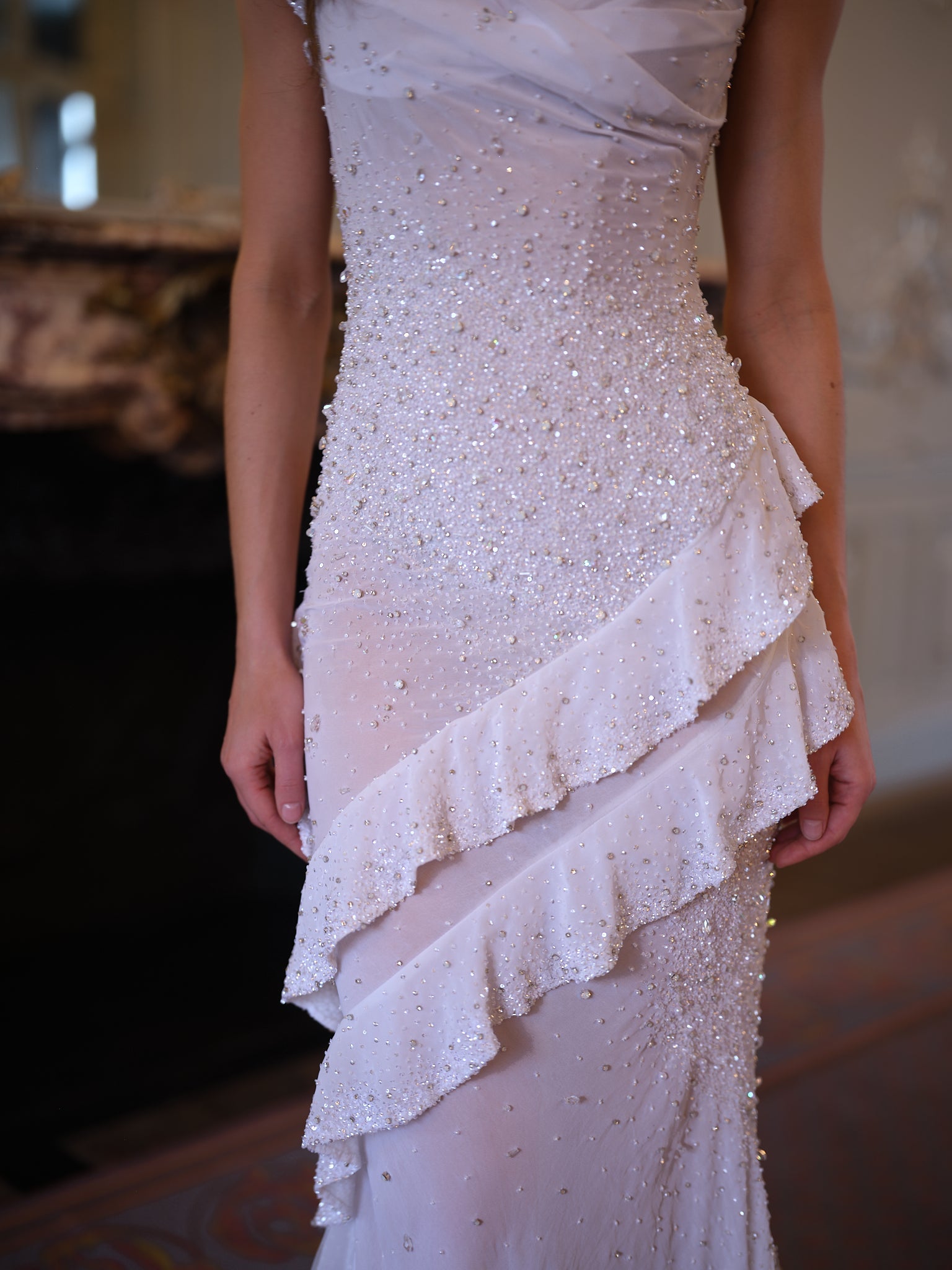 Taking over 145 hours of skilled artisan handwork, this breathtaking design is delicately encrusted with hand-placed crystals and beads layered over whisper-light chiffon. Each embellishment is thoughtfully positioned to create a luminous surface that sparkles subtly in motion, catching the light without overwhelming the softness of the silhouette.