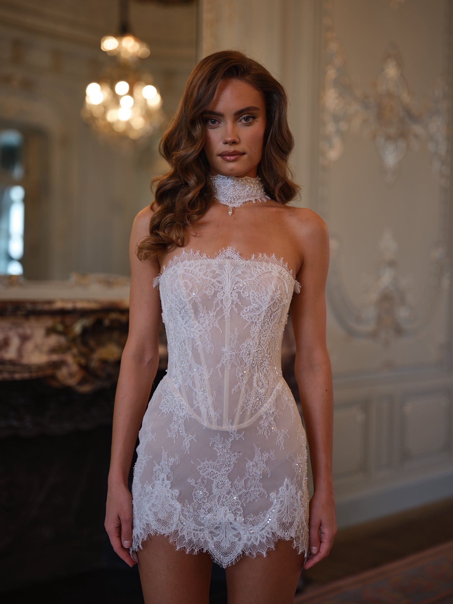 Silhouette: Fitted mini with daring yet elegant bridal appeal