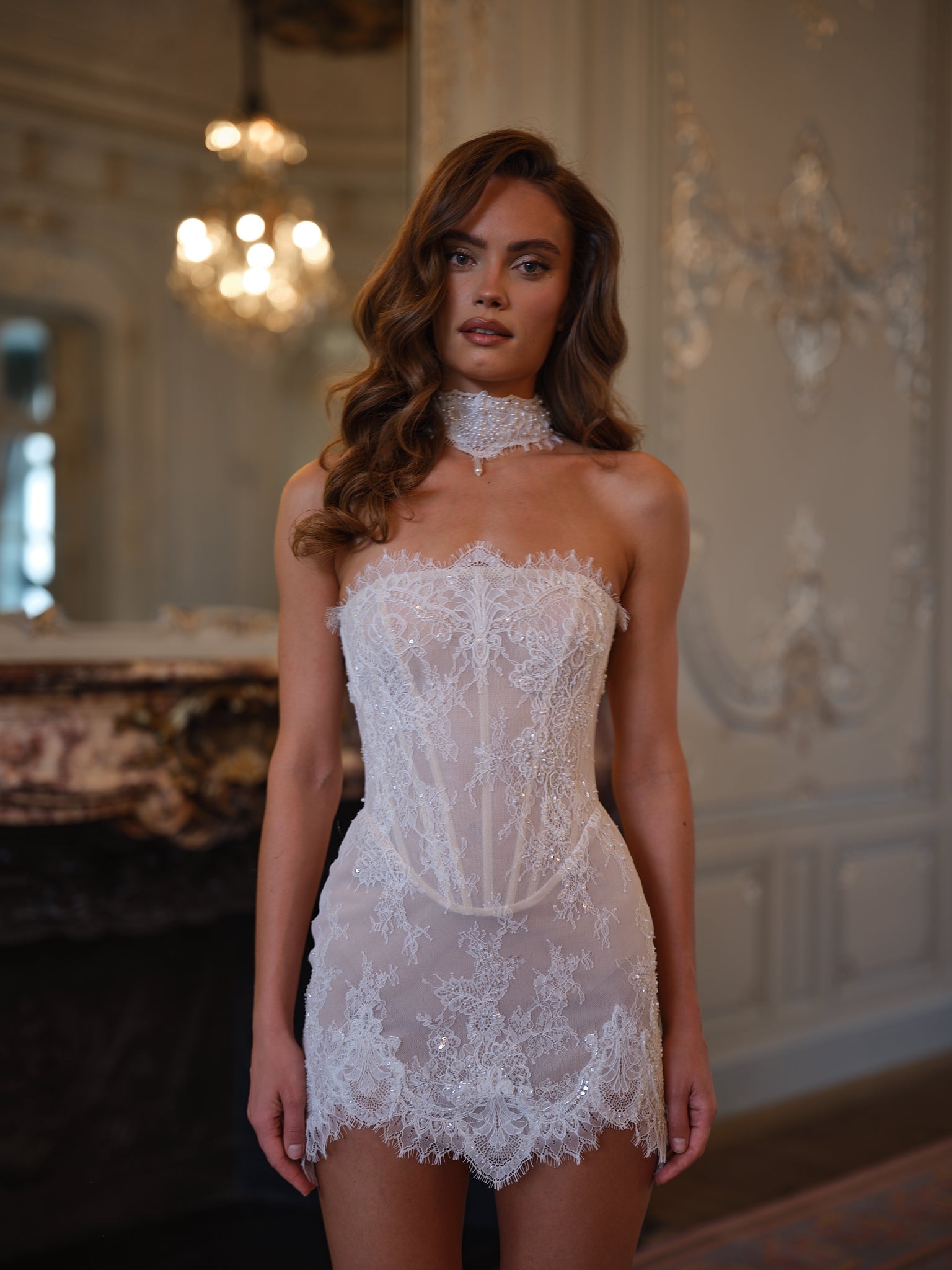 The look is completed by the matching lace and embellished choker—a statement accessory that elevates Bella into an ensemble worthy of both ceremony and celebration. Designed to turn heads, Bella is the ultimate second-dress stunner, blending sophistication with irresistible charm.