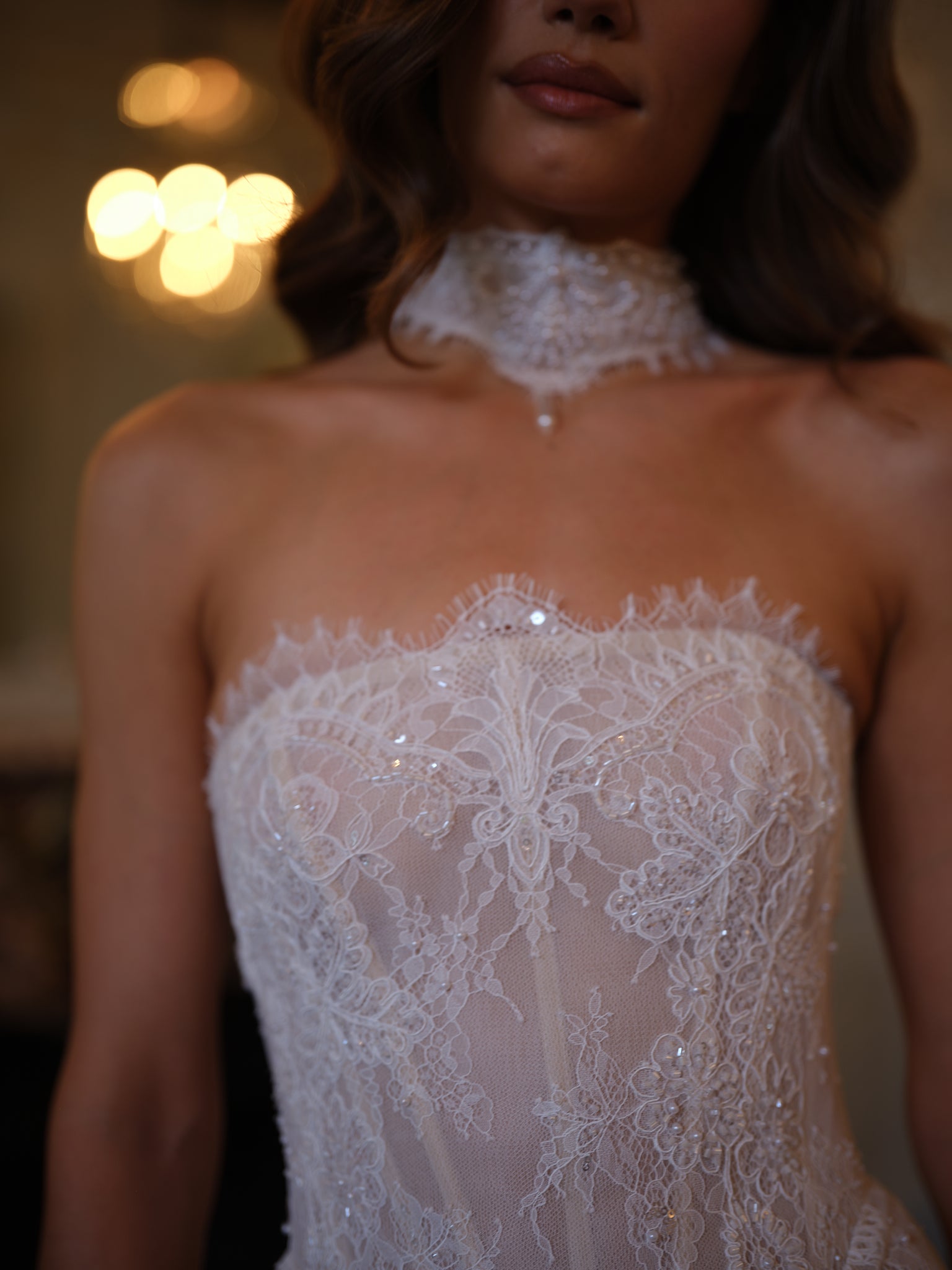 This strapless silhouette showcases a sheer lace corset bodice, artfully structured with boning to contour the figure. The delicate embroidery shimmers with tonal beadwork and sequins, creating a subtle glow under candlelight or on the dance floor. The scalloped lace hem adds a touch of refinement, balancing bold modernity with timeless bridal detail.