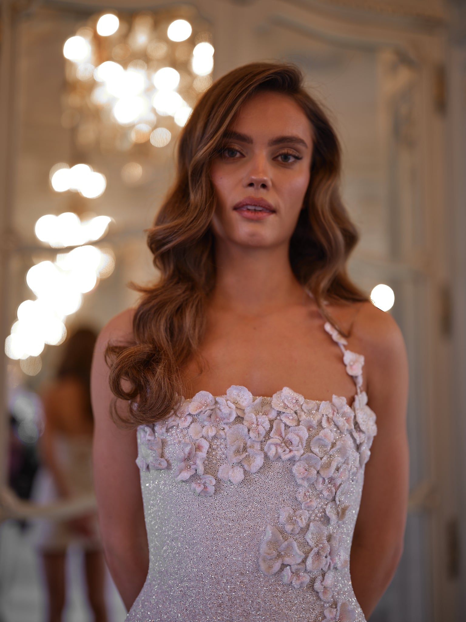Built over our signature corsetry base, Delilah requires over 130 hours of skilled artisan work. Each tiny bead is individually hand placed to create a seamless ombré fade from pure white to soft blush pink - a subtle touch of color designed for the modern bride. Delilah’s floral appliqué is a feat of craftsmanship: every petal is hand formed, embellished, and then assembled into dimensional flowers that cascade gracefully down the dress. The halter-style strap continues the theme, adorned with hand-beaded florals that frame the neckline and echo the flow of the design. A lace-up back ensures adjustability and a perfectly sculpted silhouette.