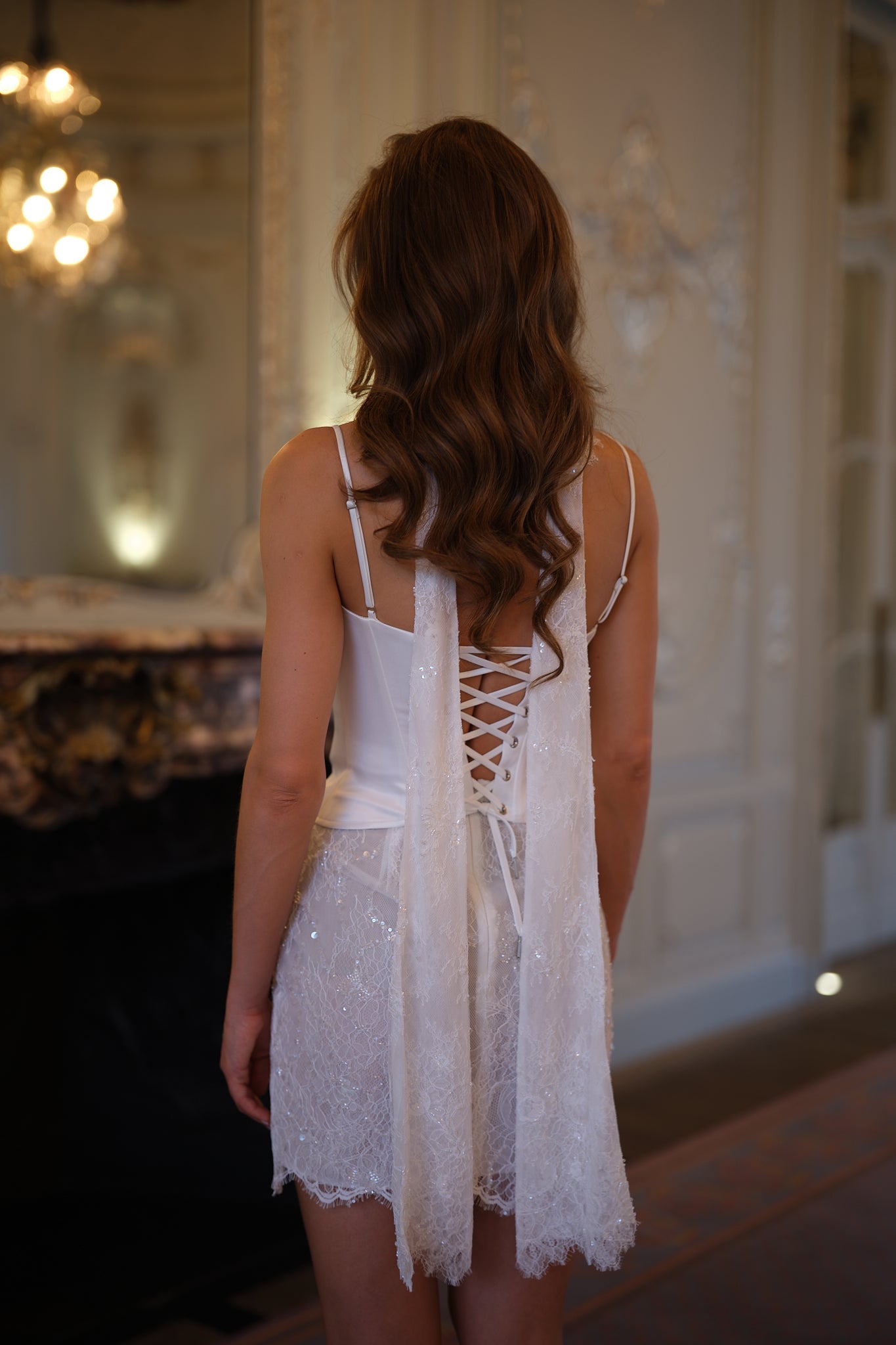 Paired with a sequin-kissed lace mini skirt, the outfit shimmers with every step. The skirt features a scalloped hem and soft movement, adding dimension and sparkle to the clean architectural lines of the bodice. A matching lace neck scarf completes the look, adding just the right amount of bridal drama.