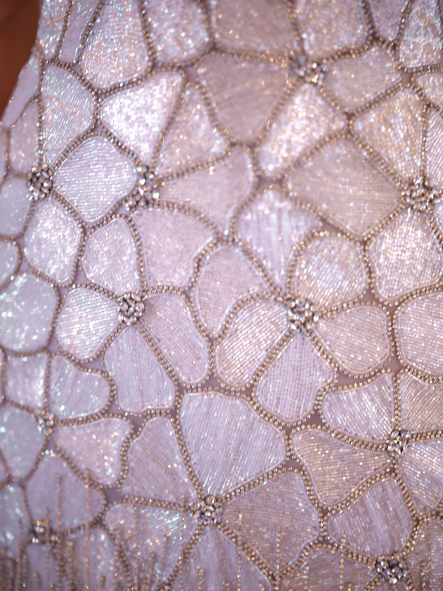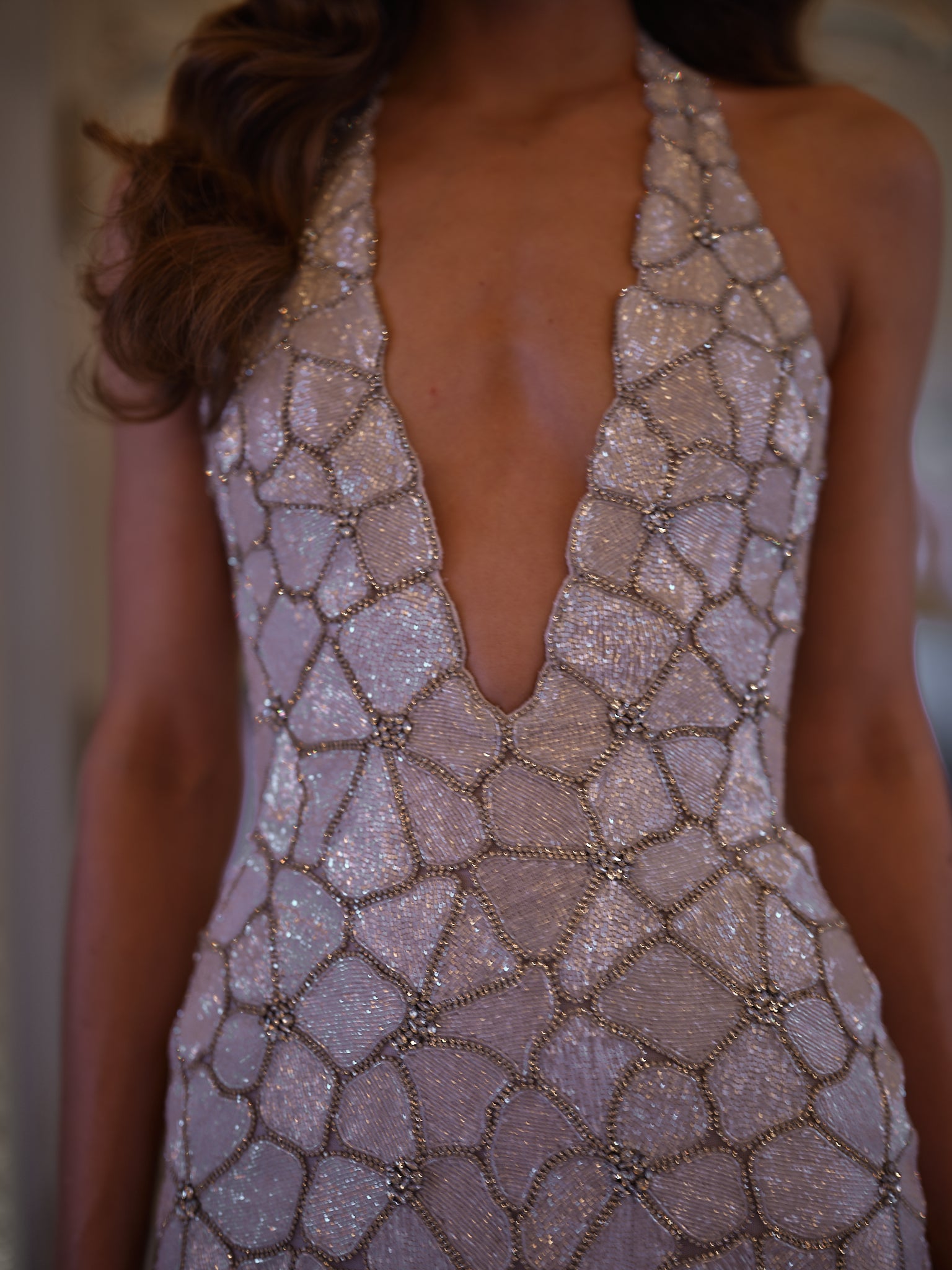 Taking over 150 hours of skilled artisan work, Natalia is built from a mosaic of hand-beaded floral shapes, each one encrusted with rhinestones for dimensional shine. The plunging halter neckline adds modern sensuality while fine rhinestone fringe frames the hem, creating dynamic movement and playful sparkle. The lace-up back not only enhances visual interest but also provides adjustability and a custom contoured fit.