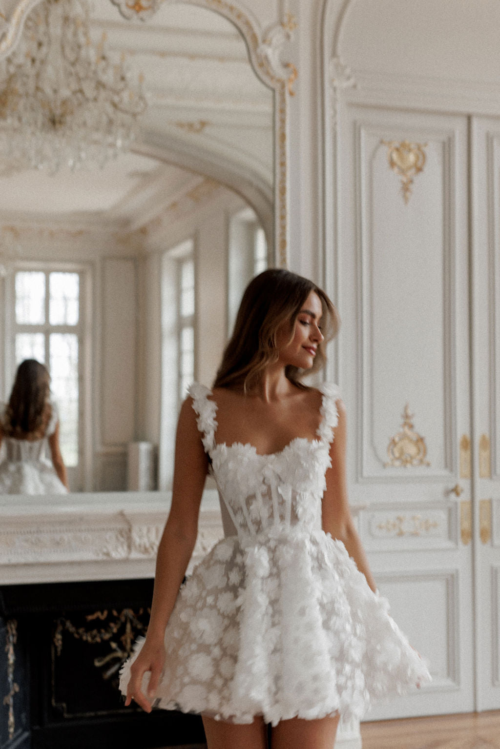 Introducing the Primrose Bridal Mini Dress, a captivating masterpiece designed for the modern bride seeking romance and sophistication. This enchanting gown is meticulously adorned with hundreds of hand-placed flowers, each delicately positioned to create a stunning visual tapestry that exudes timeless elegance.