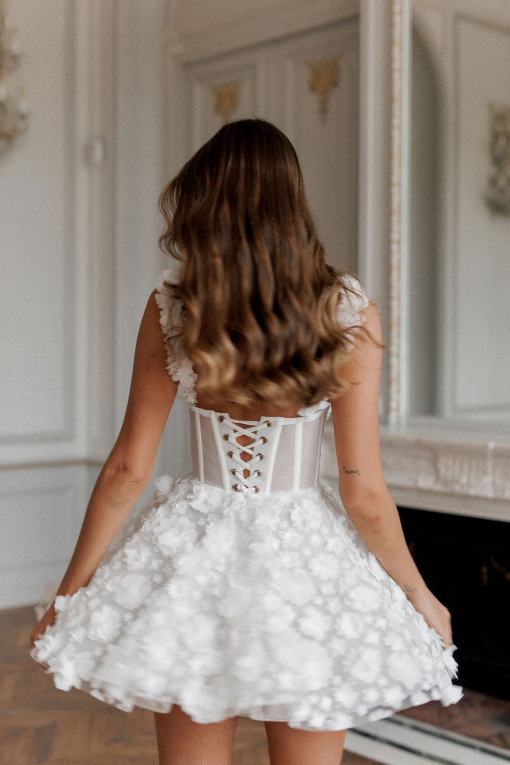 The Primrose Bridal Mini Dress is a celebration of love and femininity, crafted with meticulous attention to detail and a commitment to quality. It is the perfect choice for the bride who desires a romantic and modern look, making a statement that is as unforgettable as the love it celebrates. With its hand-placed flowers, layered European tulle, and lace-up corset, the Primrose dress is a true work of art, designed to make every bride feel like the belle of the ball on her wedding day.