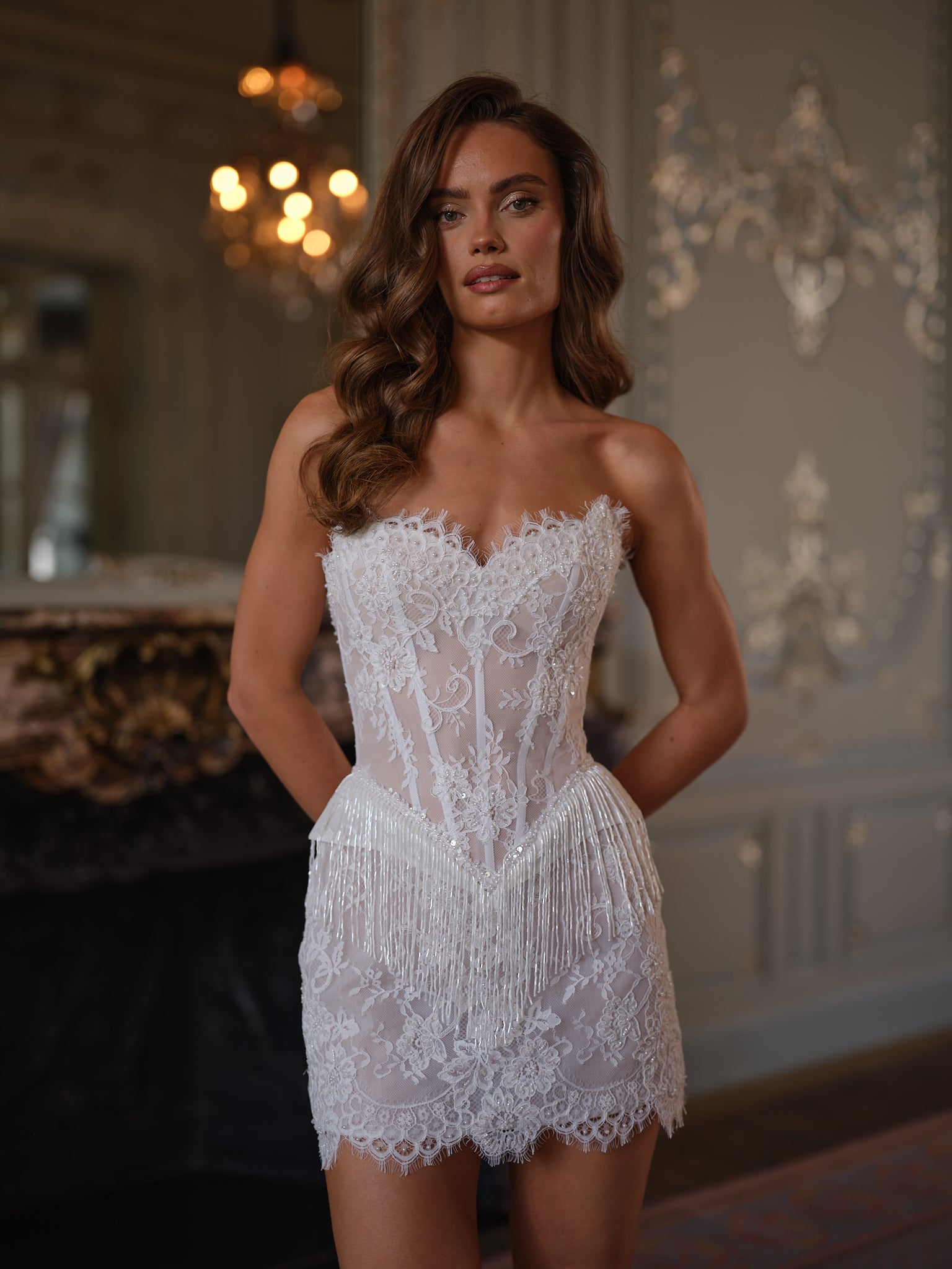The Sienna Bridal Mini Dress is a dazzling expression of joy, designed for the bride who wants to sparkle, sway, and make every step unforgettable. With its fusion of couture lace and playful fringe, Sienna reimagines bridal elegance through the lens of glamour and celebration.